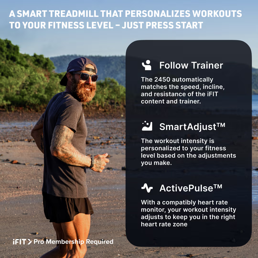 THE COMMERCIAL 2450 SMART TREADMILL ADJUSTS FOR YOU. JUST PRESS START AND IFIT DOES THE REST.¹